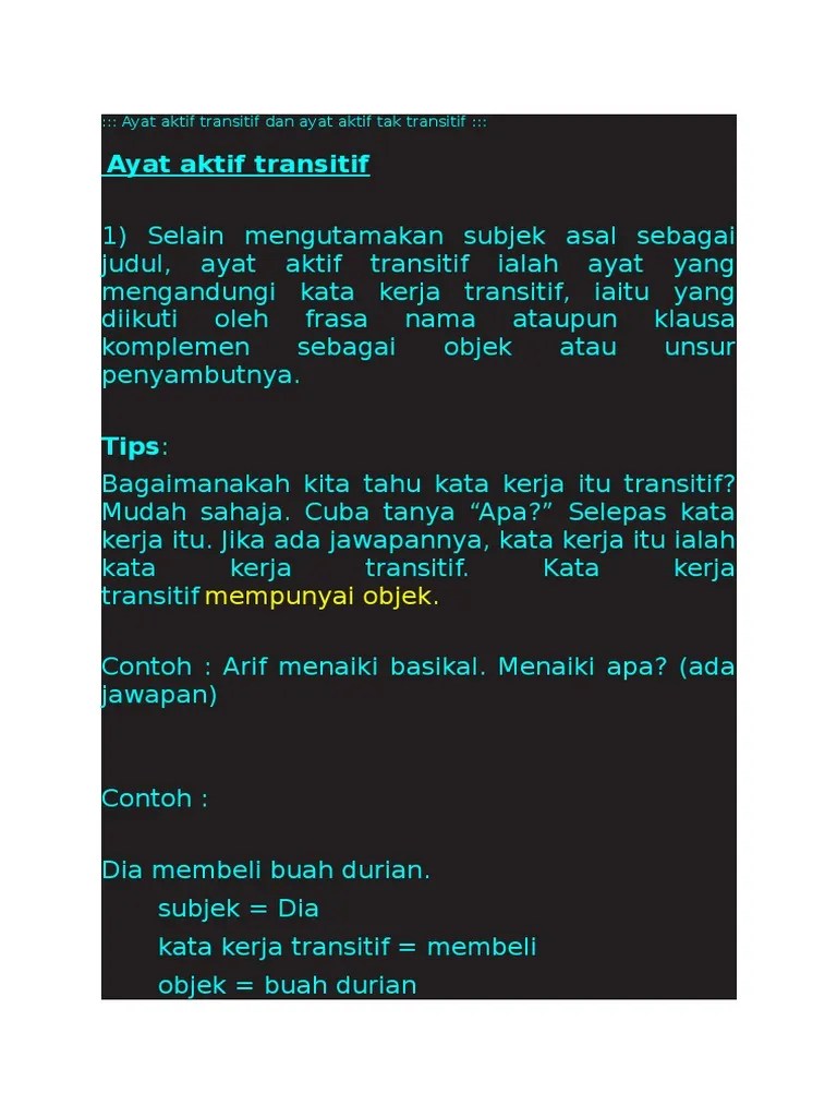 ٢٩ ربيع الأول ١٤٣٤ هـ. I contoh ayat yang menggunakan kkat: (kata kerja "menonton mesti disertai dengan objek, iaitu "drama" supaya maksud ayat ini lengkap) Kata kerja aktif tak transitif berpelengkap • kata kerja aktif tak transitif . Kata kerja ini tidak memerlukan penyambut. Tanpa pelengkap, maksud ayat jadi tergantung. Kata kerja tak transitif tanpa pelengkap ialah kata kerja yang boleh berdiri sendiri tanpa objek atau penyambut. Kata kerja tak transitif terbahagi kepada dua iaitu kata kerja tak transitif berpelengkap dan kata kerja tak . Contoh kata kerja tak transitif berpelengkap adalah seperti berikut:. (kata kerja "menonton mesti disertai dengan objek, iaitu "drama" supaya maksud ayat ini lengkap).